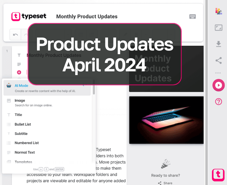 Every week Typeset learns new tricks. You’ll now find new layout designs being applied to your awesome content with the remix tool. Additionally you also have more templates to choose from including added cover pages (try them for social media posts) and card layouts that are great for text-only pages. Get to the templates drawer by clicking the wand icon or typing /templates in the editor on the left.